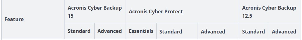 Funktionsvergleich zwischen Acronis Cyber Backup 12.5 und zwei Editionen von Acronis Cyber Protect 15: Acronis Cyber Protect und Acronis Cyber Backup 15