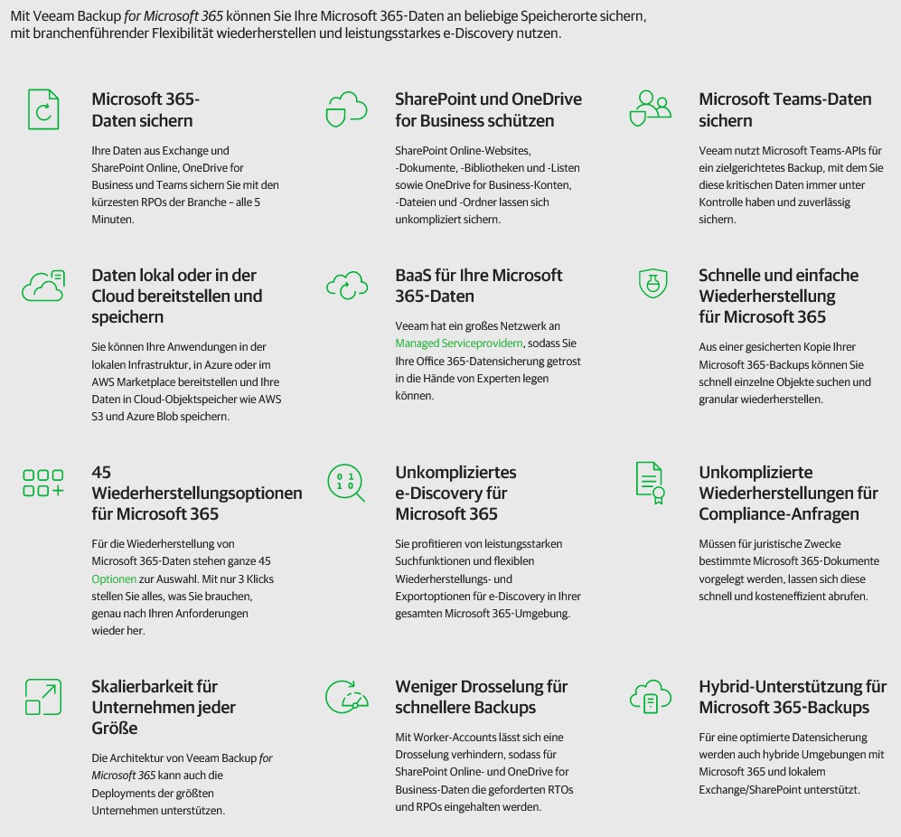 Microsoft 365 stellt eine Vielzahl leistungsstarker Services im Office-Umfeld zur Verfügung – die umfassende Sicherung Ihrer Microsoft 365-Daten gehört jedoch leider nicht dazu. Mit Veeam® Backup for Microsoft 365 verlieren Sie bei Exchange Online, SharePoint Online und OneDrive for Business nie wieder den Zugriff auf Ihre Microsoft 365-Daten oder die Kontrolle darüber – nur so sind Ihre Daten wirklich sicher und stets verfügbar.